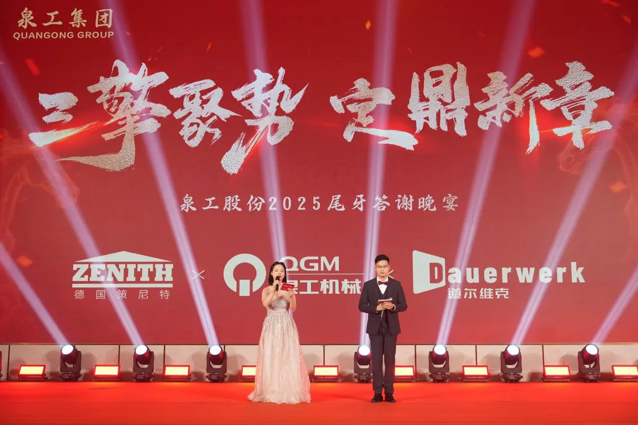 Iltapäivällä 3. helmikuutaFujian Quangong Machinery Co., Ltd.piti vuoden 2025 yhteenveto- ja palkintoseremoniansa ja uudenvuodenjuhlan Quanzhou Donghai Honor -hotellissa teemana "Kolme moottoria lähentymässä, luomassa uuden luvun". Yritysjohtajat, avainasiakkaiden edustajat, kaikki työntekijät perheineen kokoontuivat yhteen tarkastelemaan kovan työn matkaa, jakamaan kehityssaavutuksia ja odottamaan valoisaa tulevaisuutta.